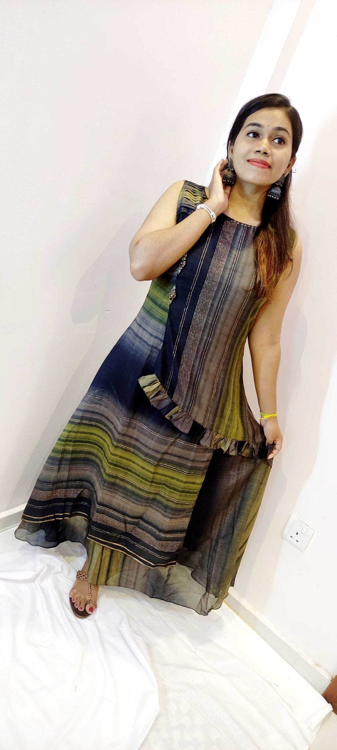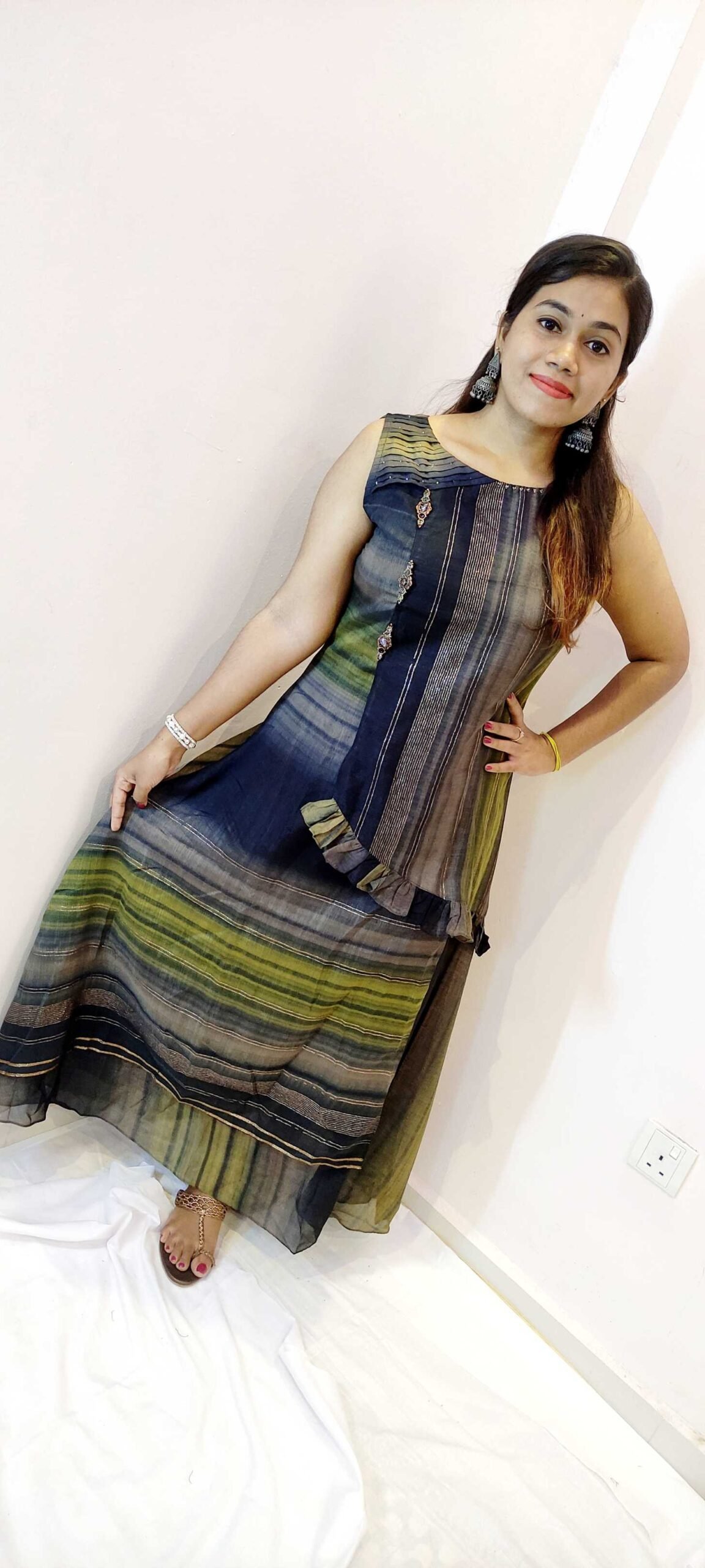 This black and mustard with gold women’s frock style kurthi is a bold, elegant choice for ladies who love rich contrast and a touch of ethnic glamour. The kurthi features a deep black base beautifully balanced with mustard and subtle gold-toned detailing, giving a festive yet wearable look that flatters many Sri Lankan skin tones. The fabric appears to be a soft-feel, breathable material, likely a rayon-type cloth, with a smooth drape and gentle frock-style flare that offers easy movement and modest coverage — ideal for Sri Lanka’s warm tropical weather. The dress-like silhouette makes this kurthi perfect for office wear, temple visits, casual outings, and semi-festive family gatherings. Pair it with black, mustard, beige, or gold-toned leggings, jeans, or palazzos and simple sandals or wedges. Add bangles and ethnic earrings to highlight the gold effect and create a polished ethnic wear look for both day and evening.