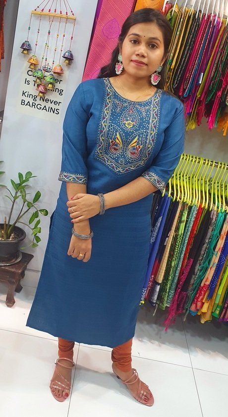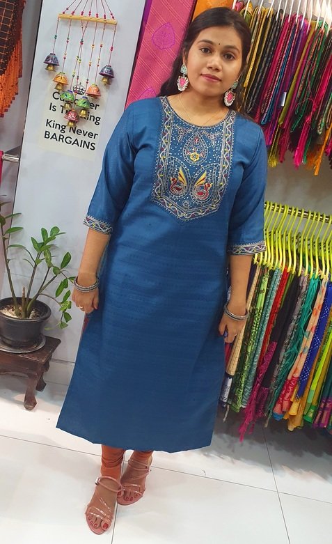 Pair this blue embroidered kurti with white, cream, beige, black, or contrast leggings, cigarette pants, or palazzos. Add silver, pearl, or oxidised jewellery, a watch, and sandals or wedges for a polished, stylish look.