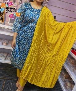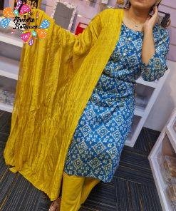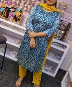 This blue and yellow ready-made shalwar suit is a bright, cheerful choice for women who love a stylish ethnic look with a modern touch. The rich blue paired with sunny yellow creates a fresh, eye-catching contrast that works beautifully for daytime and evening wear in Sri Lanka. The fabric appears to be a smooth, soft-feel material with a nice fall, keeping you comfortable even in warm tropical weather. Designed with a kurtha-style top and matching bottom, this shalwar suit gives a modest, flattering silhouette suitable for office wear, religious events, family gatherings and small functions.