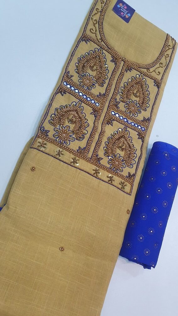 This butter and dark blue colour aari work designer shalwar material is a beautiful choice if you love soft, elegant tones with a rich ethnic touch. The fabric appears to be a soft-feel, breathable material, making it comfortable for Sri Lanka’s warm tropical weather and suitable for long wear. The gentle butter shade is contrasted with deep dark blue detailing, highlighted with delicate aari work that gives the dress material a graceful festive look without feeling too heavy. This unstitched shalwar material can be tailored into a salwar kameez, churidar set, or a stylish kurthi/kurta top according to your preferred cut and fit. Ideal for festive functions, family gatherings, temple visits, office functions with an ethnic dress code, and special occasions. Pair it with a matching or contrast dupatta, simple earrings for daytime, or traditional jewellery Sri Lanka style, bangles, and heels for a dressier look. Perfect if you wish to buy salwar material online Sri Lanka with elegant aari work.