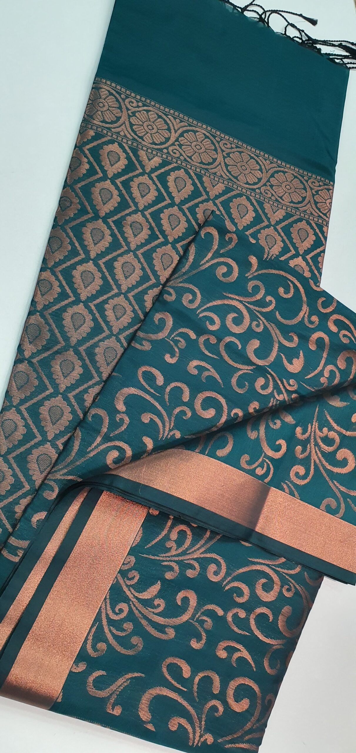 This dark green and gold soft silk saree brings a rich, traditional charm that feels perfect for special occasions. The saree appears to feature a deep dark green body, beautifully highlighted with elegant gold-toned borders and pallu, giving it a regal and timeless festive look. The soft silk-feel fabric likely offers a smooth, flowy drape and feels light on the skin, making it comfortable to wear in Sri Lanka’s warm tropical weather during weddings, receptions, homecomings or poojas. Style this traditional saree with a matching dark green blouse for a graceful, classic look, or choose a contrast gold or beige blouse to enhance the border work. Pair it with traditional jewellery Sri Lanka style — antique gold bangles, ethnic earrings or a delicate necklace set — for a complete ethnic wear outfit when you buy saree online Sri Lanka.