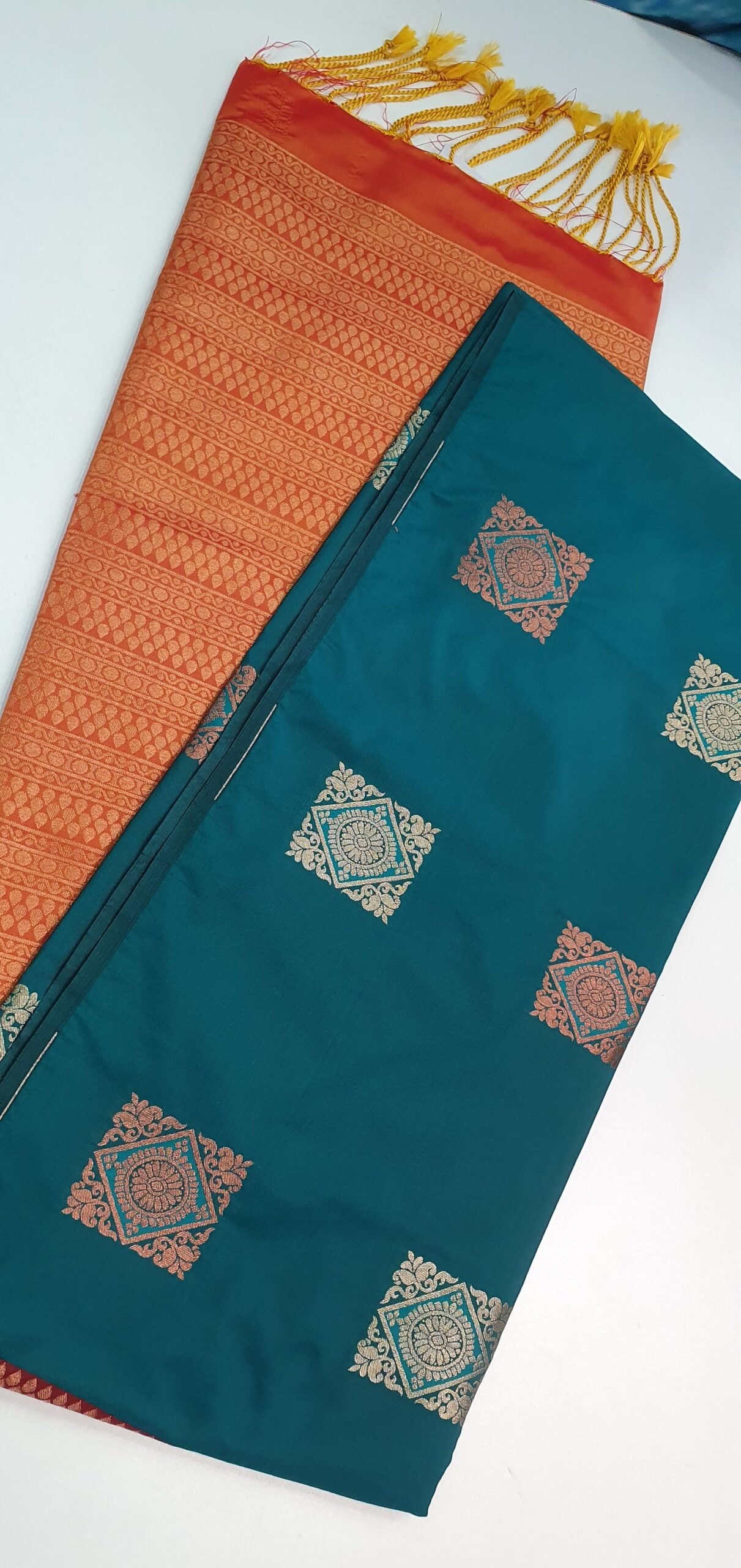 This dark green and orange soft silk saree is a striking choice if you love rich, traditional colours with a bright festive touch. The saree appears to feature a deep dark green body, beautifully contrasted with a vibrant orange border and pallu, giving a bold yet elegant look that works well for weddings, receptions, homecomings and religious functions. The soft silk-feel fabric likely has a smooth, flowy drape and feels light on the skin, making it comfortable for Sri Lanka’s warm tropical weather, even during long functions. Style this traditional saree with a matching dark green blouse for a classic, graceful look, or choose a contrast orange or gold-toned blouse to enhance the festive appeal. Complete your outfit with traditional jewellery Sri Lanka style — antique gold bangles, ethnic earrings or a delicate necklace set — to create a polished ethnic wear look when you buy saree online Sri Lanka.