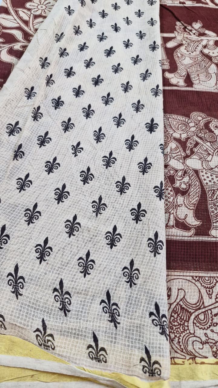 A deep maroon and beige Kotta cotton Kalamkari saree with a breathable, lightweight feel and elegant traditional look, perfect for office wear, casual outings, and simple festive moments in Sri Lanka.