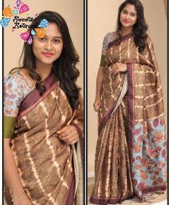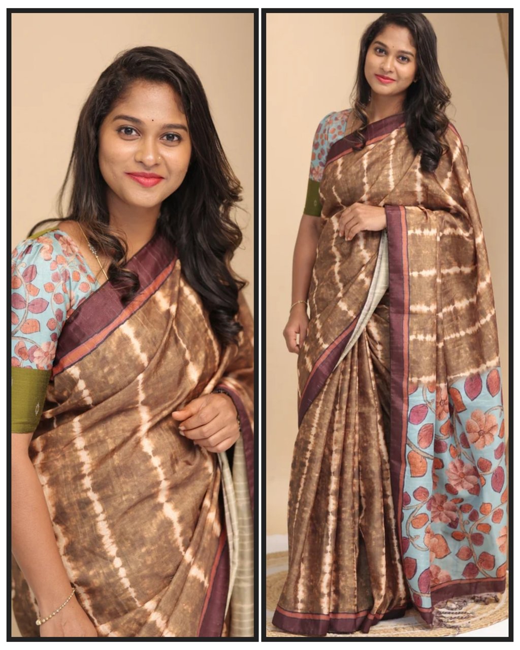 This brown colour dye kalamkari tussur silk saree beautifully blends traditional art with a rich, earthy elegance. The saree likely features a warm brown base with kalamkari-style prints or motifs, giving it a handcrafted, ethnic look that feels both classic and unique. Made from tussur (tussar) silk, it appears to have a slightly textured yet soft-feel fabric with a lightweight, flowy drape, comfortable for Sri Lanka’s warm tropical weather while still looking dressy and refined. This saree is ideal for weddings, receptions, cultural events, office functions, religious ceremonies and special family gatherings where you want a sophisticated traditional saree look. Style it with a matching brown or contrast blouse in maroon, mustard or beige, along with traditional jewellery Sri Lanka style, bangles and a clutch for a complete festive outfit. Perfect for those who appreciate artistic sarees and prefer to buy saree online Sri Lanka for special occasions and gifting.
