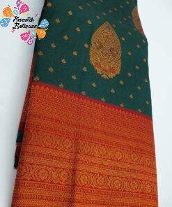 This floral designer semi silk saree in rich green with maroon and gold tones gives a very classic and elegant traditional look. The body of the saree appears to feature a delicate floral weave, while the striking big border in maroon and gold with zari-style detailing adds a beautiful festive finish. The semi silk fabric is likely smooth with a soft-feel texture and a gentle sheen, giving a graceful fall that is comfortable to wear even in Sri Lanka’s warm tropical weather.