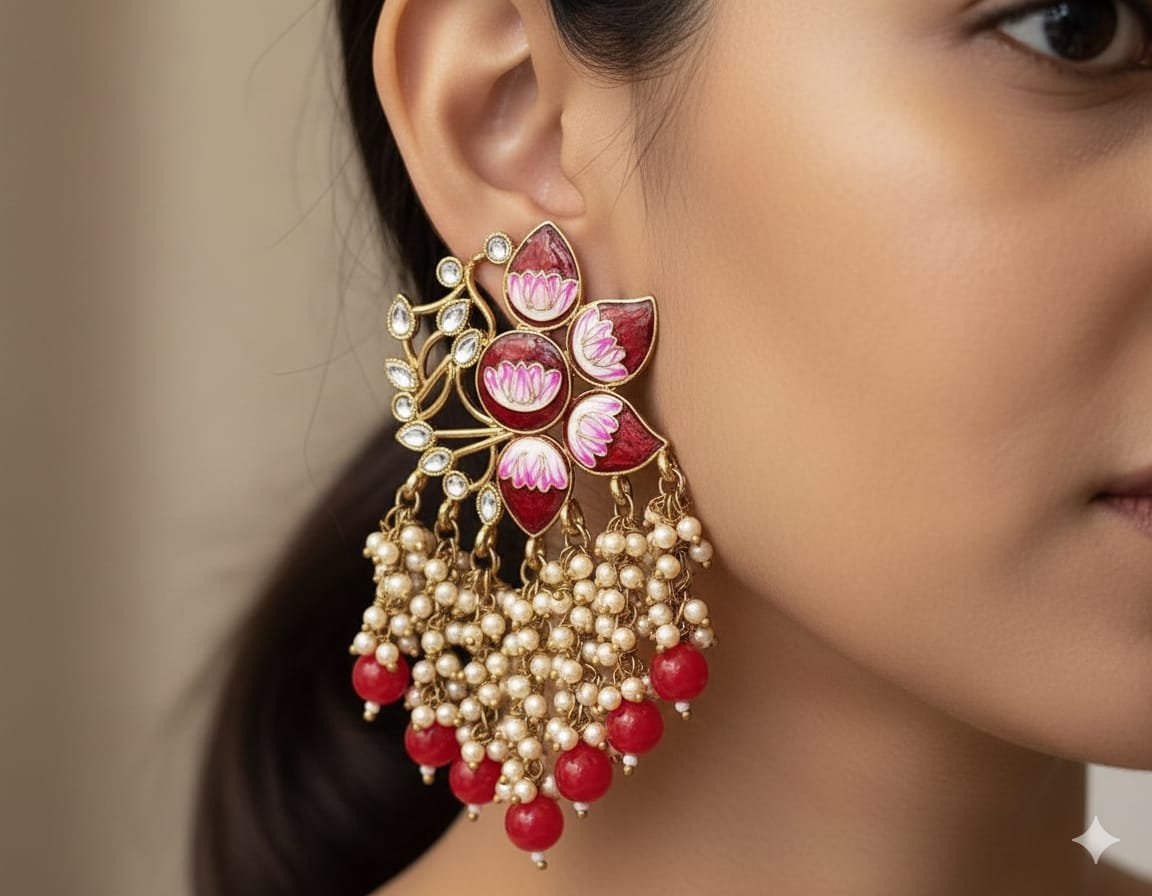 Flower Design Marroon & Pink With White Pearls Meenakari Earrings