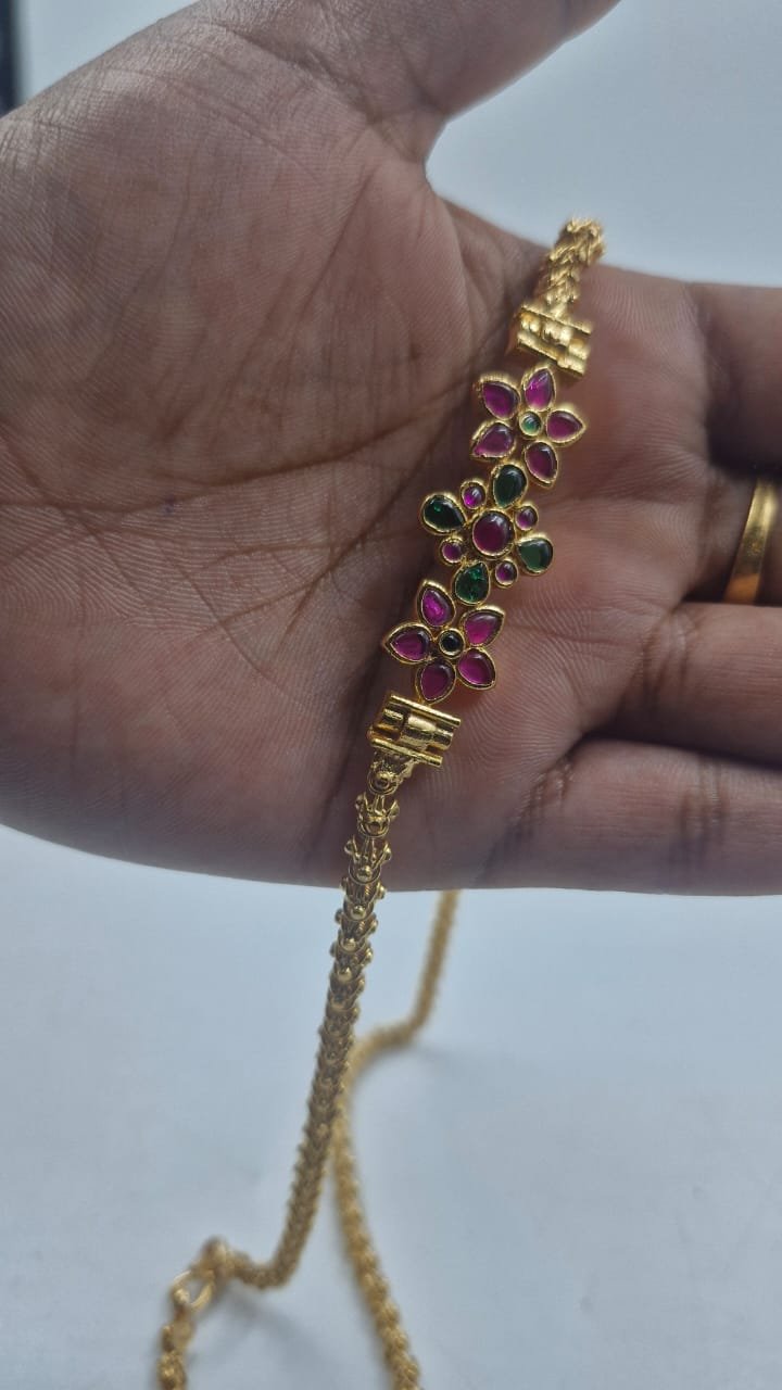 This flower designer traditional gold plated mugapu chain is a lovely piece for those who enjoy soft, feminine ethnic jewellery. The chain features a delicate mugapu (side pendant) with what appears to be a floral-inspired design, giving it a graceful and elegant look on the neckline. The gold-plated finish adds a rich, traditional touch, ideal for pairing with sarees, kurthis, and other ethnic outfits. Light and easy to wear, this mugapu chain is suitable for Sri Lanka’s warm tropical weather, allowing you to stay comfortable while still looking dressed up. Style it with jhumka earrings, simple bangles, and a soft silk saree or cotton saree for weddings, poojas, temple visits, and family functions. It also works beautifully with kurthi and churidar sets for festive gatherings or cultural events. A beautiful option if you are looking to buy traditional jewellery online Sri Lanka for yourself or as a thoughtful gift.