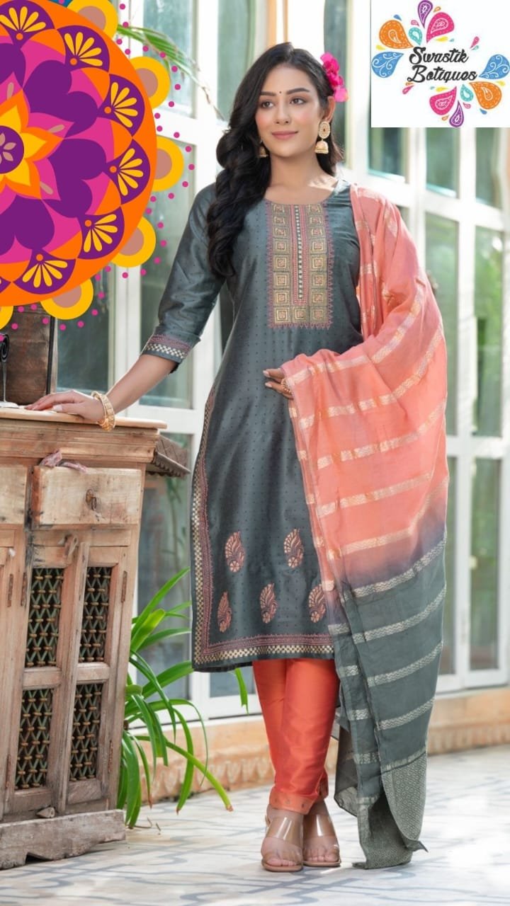 This grey and peach colour designer shalwar suit is a soft, sophisticated option for women who love subtle shades with a feminine touch. The calm grey base combined with delicate peach accents gives a modern yet traditional look that suits Sri Lankan skin tones beautifully. The fabric appears to be a soft-feel, lightweight material with a smooth fall, likely comfortable and breathable for our warm tropical weather. The ready made kameez and matching bottom come in a modest, relaxed fit that is easy to wear for long hours at poojas, work, family gatherings or small celebrations. A coordinating dupatta completes the designer look, adding an elegant drape and making dressing up simple and fuss-free. Style this grey and peach shalwar kameez with gold-tone or rose-gold jewellery, bangles and simple sandals or wedges for a classy ethnic appearance. Ideal for anyone looking to buy a graceful designer shalwar suit online in Sri Lanka without any stitching hassle.