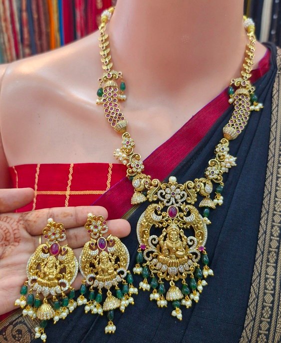 Lakshmi designer matte finished temple harram in an antique gold–tone look, perfect as a long statement necklace with silk and Kandyan sarees. Ideal for weddings, poruwa, muhurtham, receptions and festive pooja occasions across Sri Lanka.