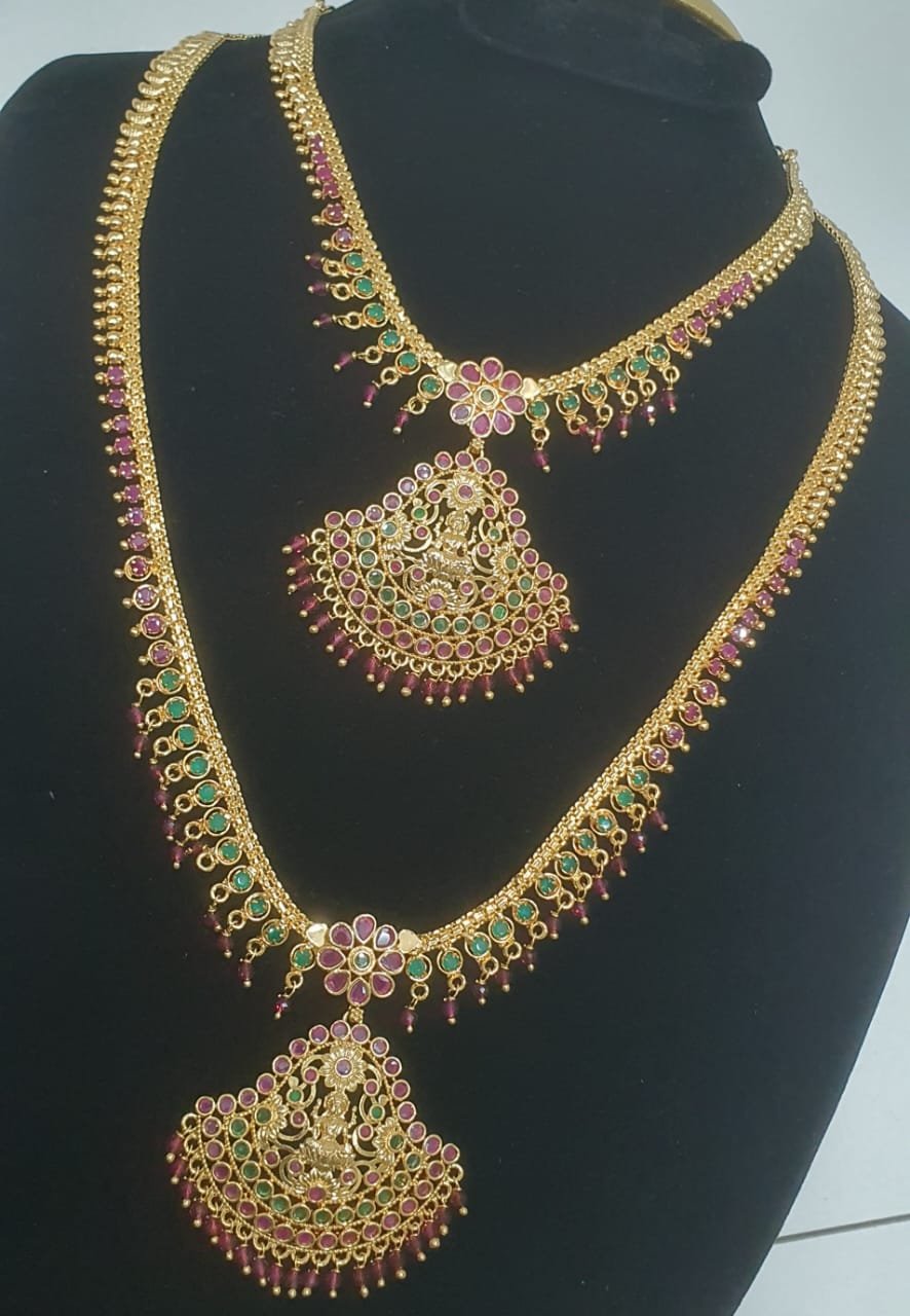 This Lakshmi designer micro-plated jewellery set is a lovely choice for those who adore traditional South Indian–style temple jewellery with a divine touch. The necklace appears to feature a central Lakshmi motif surrounded by intricate detailing in a rich gold-tone micro-plated finish, giving it a graceful and auspicious look. The design likely sits neatly along the neckline, making it perfect to pair with silk sarees, Kanjivaram sarees, soft cotton sarees, or elegant kurthis for special occasions in Sri Lanka.