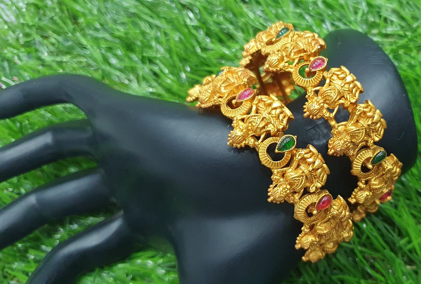 This Lakshmi matte finished bangle set is a beautiful pick if you love classic temple jewellery with a soft, traditional look. The bangles appear in a rich matte gold-tone finish, detailed with Lakshmi motifs that give a divine, auspicious feel on the wrists. The design looks traditional yet elegant, making it ideal for weddings, poojas, Navaratri, home functions and festive events across Sri Lanka. These temple-style bangles pair wonderfully with soft silk sarees, Kanchipuram-style sarees, cotton sarees and ethnic churidar or kurthi sets, adding a graceful South Indian and Sri Lankan cultural touch. You can style them alone for a simple look or mix with glass bangles for a fuller bridal stack. Match with Lakshmi haram, jhumkas or a simple chain to complete your traditional jewellery Sri Lanka look for both brides and guests.