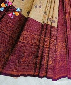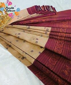 This off-white and dark purple silk cotton saree is a beautiful choice if you love calm, elegant colours with a rich traditional touch. The saree likely features a soft off-white body that gives a very graceful and refined look, beautifully highlighted with a bold dark purple big border that adds a striking, festive contrast. The silk cotton fabric is usually lightweight and breathable, making it comfortable for Sri Lanka’s warm tropical weather while still giving a neat, slightly crisp drape that feels dressy. This traditional saree is perfect for weddings, poojas, home functions, cultural events, or even special office days. Style it with a matching dark purple blouse for a classic look, or pair with an off-white or gold-toned blouse for a softer, sophisticated finish. Complete your outfit with traditional jewellery, bangles and a clutch – a lovely option if you are looking to buy saree online in Sri Lanka.