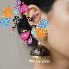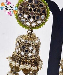 This olive green and white pearl designer kundan jhumkha pair is a gorgeous choice if you love subtle yet royal ethnic earrings. The jhumkas appear to feature a rich gold-tone base with intricate kundan-style stone work, highlighted by elegant olive green stones that give a unique, classy touch near the face. Delicate white pearl-style drops along the edge add gentle movement and a soft traditional finish, making these earrings perfect for both day and evening functions. The dome-shaped jhumka design looks festive yet wearable, suitable for long hours at weddings, homecomings, receptions, poojas and festive events in Sri Lanka’s warm tropical weather. Style these kundan jhumkhas with soft silk sarees, organza sarees, pastel or deep-toned lehengas and anarkali suits for a graceful Indo-Sri Lankan look. They also pair beautifully with simple kurthis for a dressy occasion outfit or bridesmaid styling.