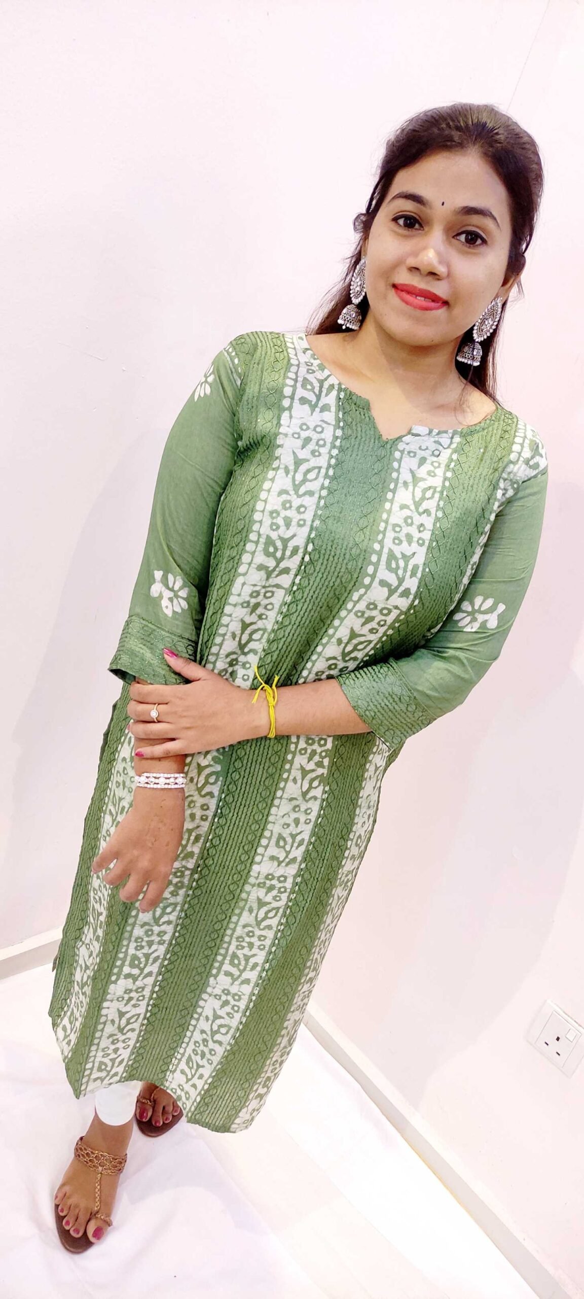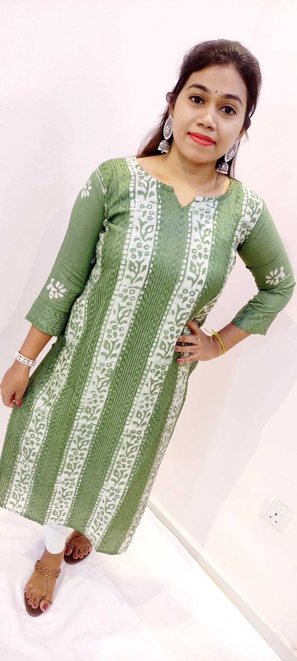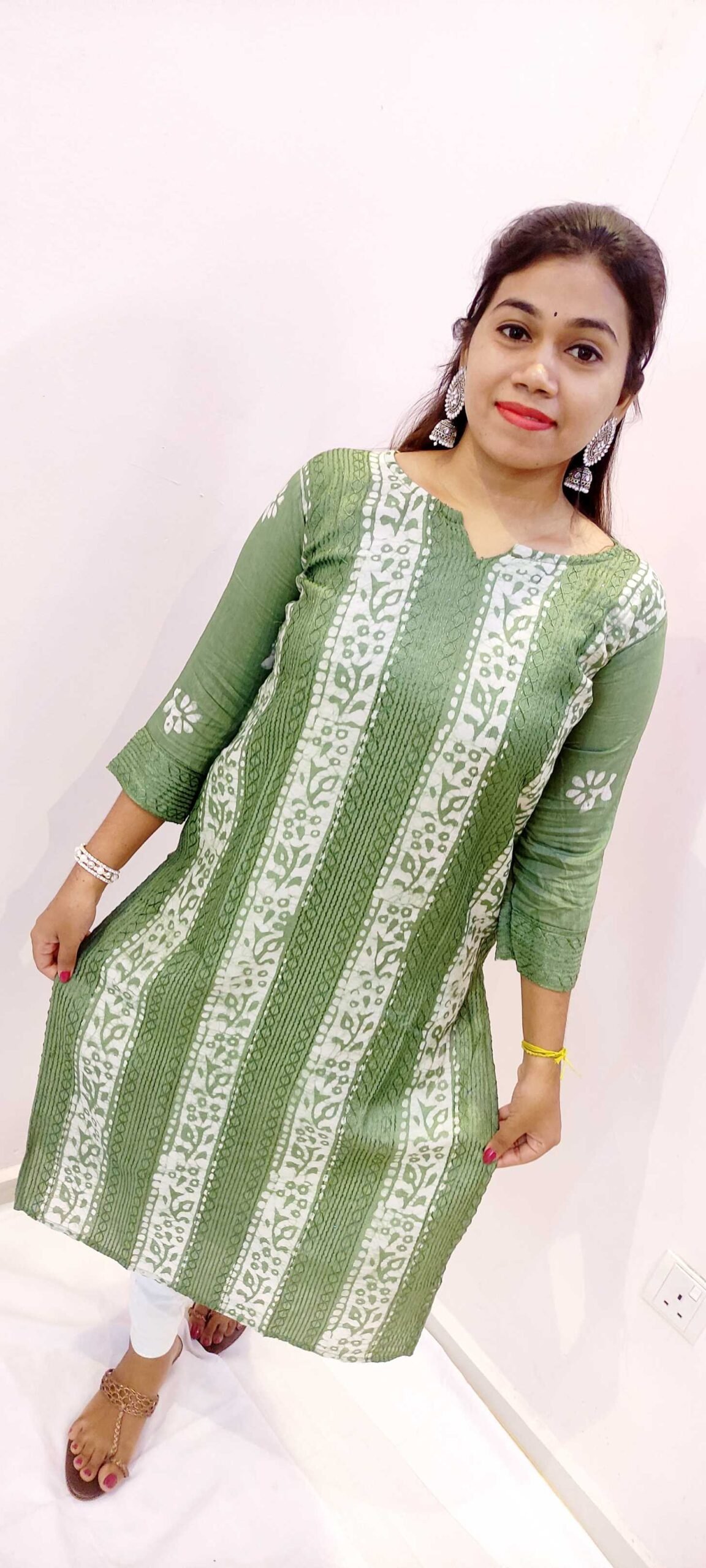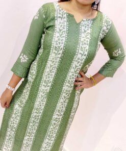 Style this olive green-white kurthi top with white leggings, denim jeans, or slim-fit trousers for a neat Indo-western look. You can also pair it with palazzos for a more relaxed, contemporary feel. Complete your outfit with simple studs or small hoops, a bracelet or watch, and flat sandals or wedges. It’s a great choice if you are looking to buy a side-open casual kurti or women’s kurtha top online in Sri Lanka in a unique, sophisticated colour.