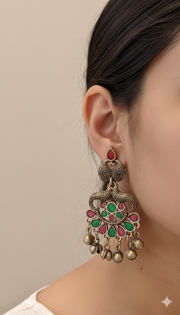 Peacock Designer Green And Red Oxidised Silver Earrings