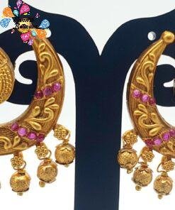 These peacock designer matte finished earrings bring a graceful mix of tradition and elegance, perfect for ethnic wear lovers in Sri Lanka. The earrings appear to feature a classic peacock motif with intricate detailing, finished in a soft matte gold-style tone that looks rich without being too shiny. The design gives a traditional South Indian–inspired feel, while still being stylish enough for modern outfits. They seem to be medium in size and likely lightweight, making them comfortable for long wear in our warm tropical weather.
