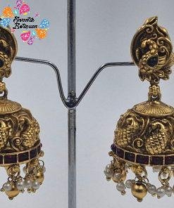 This elegant peacock designer matte finished jhumka is perfect for those who love traditional jewellery with a touch of royal charm. The earring design appears to feature a beautifully detailed peacock motif at the top, flowing into a classic dome-shaped jhumka with a soft matte finish that gives an antique gold look. The matte texture makes it look graceful in photos and gentle under bright lights, ideal for weddings, receptions, home functions and festive events in Sri Lanka. This ethnic earring style pairs beautifully with traditional sarees, soft silk sarees, bridal wear and rich kurtis or kurthis. You can style this peacock jhumka with bangles and a simple necklace for a complete traditional jewellery Sri Lanka look, perfect for occasions in Colombo or across the island. A lovely choice for bridesmaids, party wear or as a special gift for someone who loves ethnic earrings.