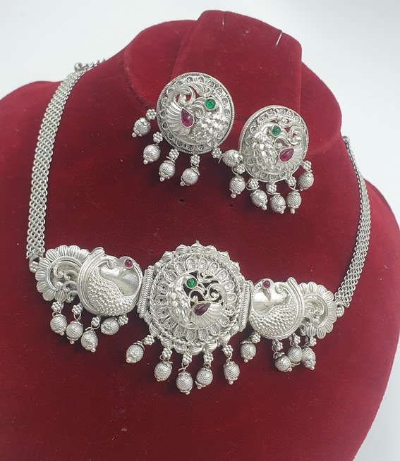 Peacock Designer  Matte Silver Chocker Necklace