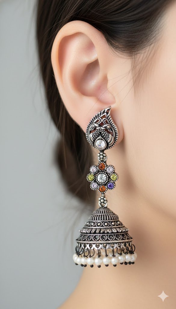 They’re ideal for Sri Lankan weather too, as this style is usually comfortable for long hours—perfect for temple visits, family gatherings, festive events, weddings, and even office ethnic days. Style them with a saree and a contrast blouse for a richer traditional look, or wear them with a simple kurthi and palazzos to instantly elevate your outfit. Add bangles or a delicate chain to keep the look balanced and elegant. If you’re searching for traditional jewellery Sri Lanka or want to buy silver jhumkas online Sri Lanka, this peacock design is a timeless pick.
