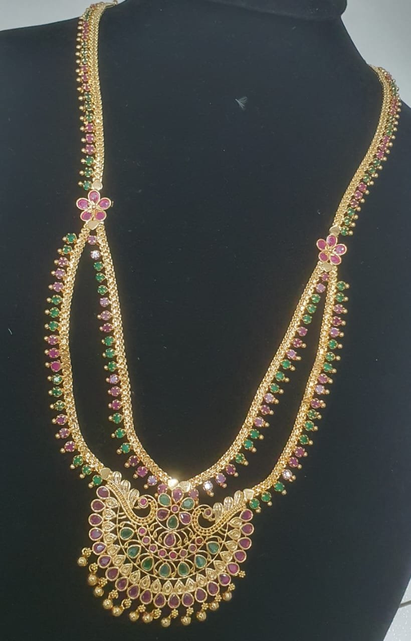 The gold-plated finish adds a traditional charm that suits both bridal and occasional wear. Style this peacock necklace with matching jhumka earrings, bangles, and a neatly styled bun or braid to complete your ethnic look. It is a beautiful option for those searching for traditional jewellery Sri Lanka, temple-style jewellery, or designer necklace sets for sarees and kurtis through online shopping SL.