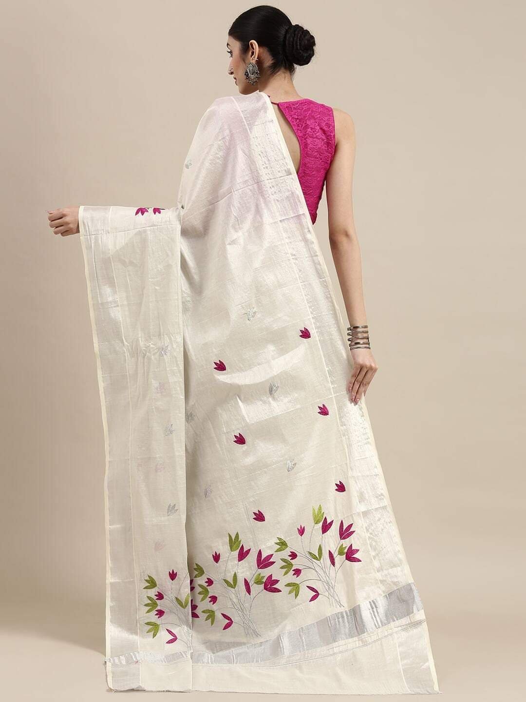 Style this saree with a matching or contrast blouse in pink, green, off-white, or gold and complete your look with traditional jewellery Sri Lanka favourites like jhumkas, bangles, and a delicate necklace. Perfect if you are looking to buy saree online Sri Lanka for graceful, modern-traditional wear.
