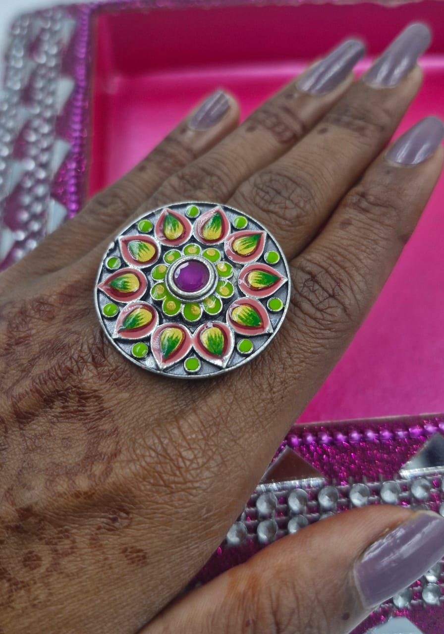This premium meenakari silver ring appears to feature beautiful traditional enamel-style detailing, giving it a rich and elegant ethnic look. The ring is likely crafted from a metal alloy with a silver-finish tone, decorated with colourful meenakari-style patterns that add charm without being too flashy. Its design looks perfect to pair with sarees, kurthis and other ethnic wear, making it ideal for weddings, festivals, poojas, parties or even to dress up a simple everyday outfit.