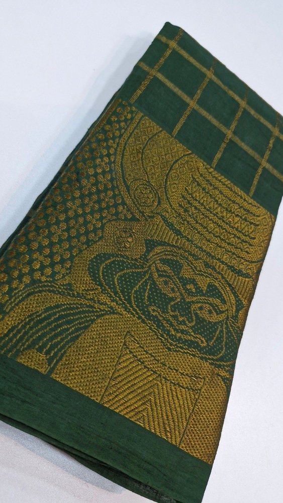 This sea green premium Kathakali face designer Sungudi cotton saree beautifully blends culture, artistry and everyday comfort. The body appears in a soothing sea green shade, giving a fresh, elegant base, while the pallu and borders feature striking Kathakali face style motifs, adding a rich South Indian cultural touch. Crafted in premium soft-feel Sungudi cotton, the saree likely offers a breathable, lightweight drape that feels very comfortable on the skin, ideal for Sri Lankan tropical weather during long hours at temple, cultural events or family gatherings.