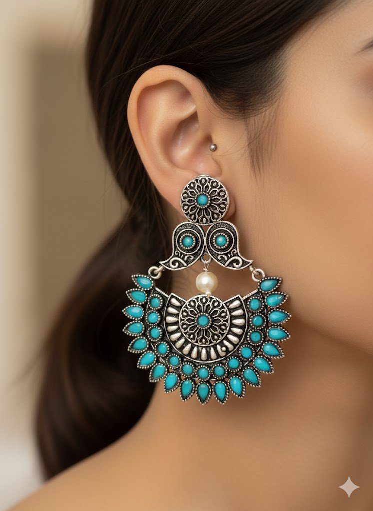 Soft sky blue floral oxidised earrings with an antique silver-tone finish, perfect to pair with kurtis, tunics and sarees for office, poojas, outings and festive occasions in Sri Lanka’s tropical weather.