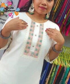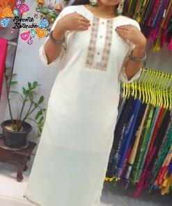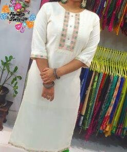 Pair this white embroidered kurti with black, navy, beige, or colourful leggings, cigarette pants, or palazzos. Add silver, pearl, or oxidised jewellery, a watch, and sandals or wedges for a polished everyday or office look. A lovely option if you want to buy an embroidered kurthi online Sri Lanka that is light, versatile, and easy to style.
