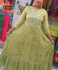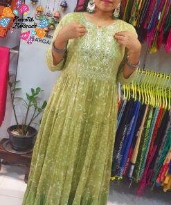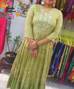 Pair this white and dark green embroidered kurti with dark green, white, black, or beige leggings or slim trousers. Complete your look with simple earrings, bangles, and flat sandals or wedges for a neat, put-together outfit. A lovely choice if you want to buy an embroidered frock style kurthi online Sri Lanka that feels light, looks refined, and is easy to style.
