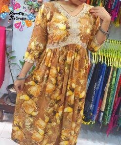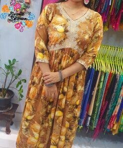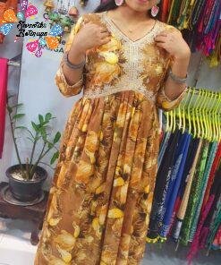Pair this yellow-brown Alya cut kurti with white, cream, brown, black, or denim leggings and jeans. Add simple earrings, a watch, and flat sandals or wedges for a chic, everyday look. A lovely choice if you want to buy a trendy Alya cut kurthi online Sri Lanka that feels light, looks modern, and is easy to style.